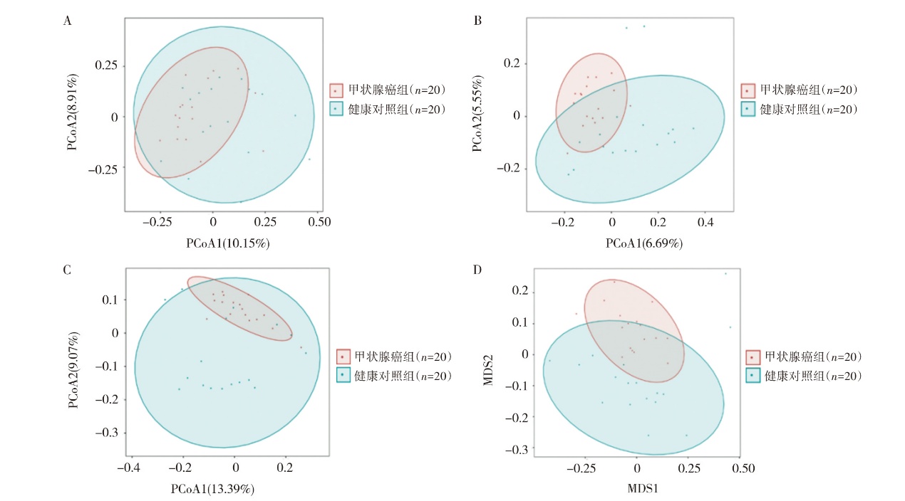 | 菌属 | 甲状腺癌组(n=20) | 健康对照组(n=20) | U值 | P值 |
