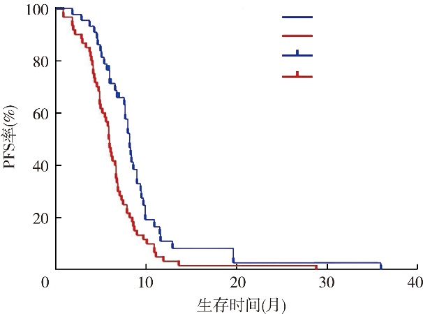 | 血小板减少 | 13(29.55) | 10(16.66) | 2.44 | 0.118 | 间质性肺炎 | 3(6.82) | 2(3.33) | 0.648 | |