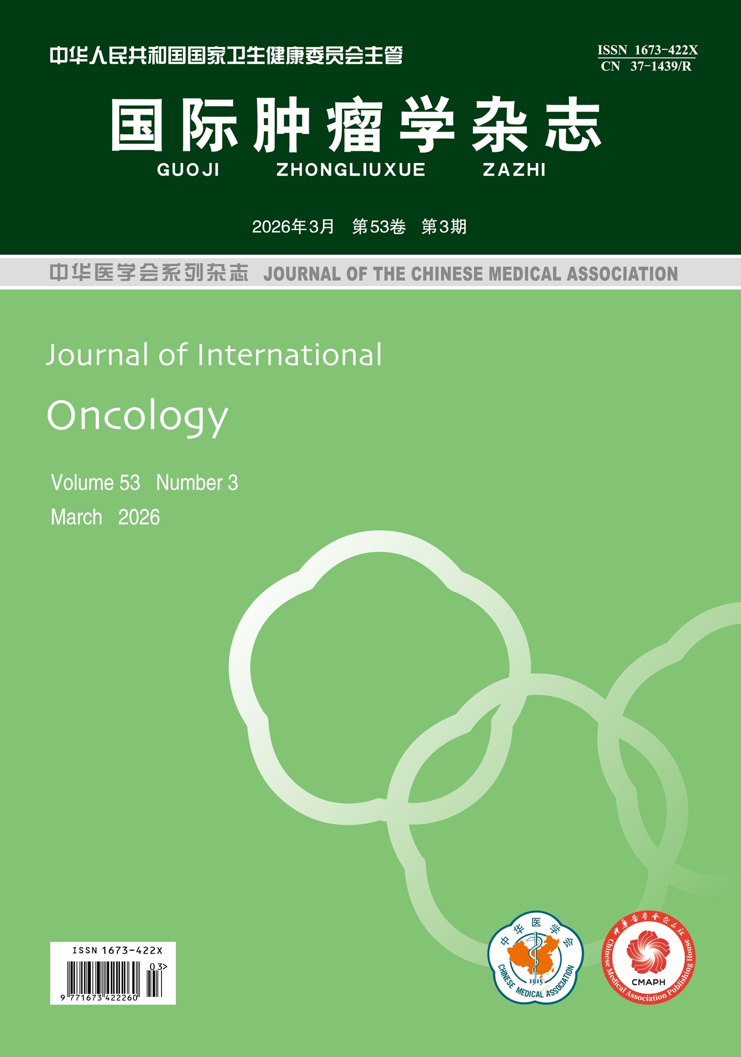 Objective To investigate the effects of long non-coding RNA (lncRNA) cancer susceptibility candidate 19 (CASC19) on the proliferation,migration and invasion of breast cancer cells by regulating the microRNA-410-3p (miR-410-3p)/laminin γ1 (LAMC1) signaling pathway. Methods A total of 53 pairs of breast cancer tissues and adjacent tissues of patients treated at Shiyan Renmin Hospital of Hubei Province from January 2023 to January 2024 were collected. The breast cancer MCF-7 cells were divided into the NC group,the sh-NC group,the sh-CASC19 group,the sh-CASC19+anti-NC group,and the sh-CASC19+anti-miR-410-3p group. The interaction between CASC19 and miR-410-3p,and between miR-410-3p and LAMC1 were verified by dual-luciferase reporter gene assay. The expression levels of CASC19,miR-410-3p and LAMC1 mRNA of MCF-7 cells in breast cancer tissues and adjacent tissues and in each group were detected by quantitative real-time PCR,cell proliferation was measured by EdU staining and CCK-8 assay,cell migration ability was evaluated by scratch assay,cell invasion ability was determined by Transwell assay,Western blotting was applied to detect the expression of proliferating cell nuclear antigen (PCNA),LAMC1,and matrix metalloproteinase-2 (MMP-2) proteins. Results The relative expression levels of CASC19 in adjacent tissues and breast cancer tissues were 1.01±0.30 and 1.65±0.31,respectively,miR-410-3p were 0.99±0.17 and 0.53±0.15,respectively,and LAMC1 were 1.00±0.29 and 1.48±0.31,respectively,with statistically significant differences (t=37.92,P<0.001; t=37.87,P<0.001; t=21.24,P<0.001). The results of the dual-luciferase reporter gene assay showed that,CASC19 could target and negatively regulate miR-410-3p,and miR-410-3p could target and negatively regulate LAMC1. The relative expression levels of CASC19 in breast cancer MCF-7 cells from the NC,sh-NC,sh-CASC19,sh-CASC19+anti-NC,and sh-CASC19+anti-miR-410-3p groups were 1.01±0.16,0.96±0.16,0.37±0.13,0.34±0.11,0.35±0.11,respectively,miR-410-3p were 1.00±0.33,1.07±0.34,1.92±0.38,1.88±0.39,1.34±0.37,respectively,and LAMC1 mRNA were 1.00±0.17,1.05±0.17,0.44±0.13,0.41±0.13,0.89±0.15,respectively,with statistically significant differences (F=39.05,P<0.001; F=8.72,P<0.001; F=25.21,P<0.001). Compared with the NC and sh-NC groups,the expression of CASC19 in the sh-CASC19,sh-CASC19+anti-NC,and sh-CASC19+anti-miR-410-3p groups decreased significantly (all P<0.05),the expression of miR-410-3p in sh-CASC19 group and sh-CASC19+anti-NC group increased significantly,while the expression of LAMC1 mRNA decreased significantly (all P<0.05). Compared with the sh-CASC19 and sh-CASC19+anti-NC groups,the expression of miR-410-3p in the sh-CASC19+anti-miR-410-3p group decreased significantly,while the expression of LAMC1 increased significantly (all P<0.05). The EdU-positive cell rates in the five groups were (45.93±5.04)%,(46.07±5.13)%,(19.26±3.25)%,(20.43±3.36)%,(37.85±4.86)%,respectively,the cell viability values were (100.00±0.00)%,(97.26±9.87)%,(46.27±7.12)%,(47.23±7.08)%,and (86.39±9.05)%,respectively,with statistically significant differences (F=54.34,P<0.001; F=76.76,P<0.001). The scratch healing rates were (47.85±4.90)%,(48.03±4.87)%,(23.97±3.51)%,(23.42±3.26)%,and (39.54±4.12)%,respectively,the numbers of invasion were 114.62±10.98,113.78±11.87,64.53±9.41,65.14±9.04,97.86±10.27,respectively,with statistically significant differences (F=51.26,P<0.001; F=34.81,P<0.001). The protein expression levels of PCNA were 1.14±0.14,1.17±0.15,0.34±0.10,0.36±0.11,0.93±0.13,respectively,LAMC1 were 1.37±0.15,1.32±0.14,0.59±0.09,0.61±0.09,and 1.18±0.12,respectively,MMP-2 were 0.93±0.13,0.88±0.10,0.23±0.07,0.25±0.08,0.76±0.10,respectively,with statistically significant differences (F=62.32,P<0.001; F=58.94,P<0.001; F=73.41,P<0.001). Compared with the NC and sh-NC groups,the EdU-positive cell rate,cell viability value,scratch healing rate,number of invasion,and protein expression levels of PCNA,LAMC1,and MMP-2 in the sh-CASC19 and sh-CASC19+anti-NC groups decreased significantly (all P<0.05). Compared with the sh-CASC19 and sh-CASC19+anti-NC groups,these indices in the sh-CASC19+anti-miR-410-3p group increased significantly (all P<0.05). Conclusions lncRNA CASC19 may promote the proliferation,migration,and invasion of breast cancer cells by regulating the miR-410-3p/LAMC1 signaling pathway.